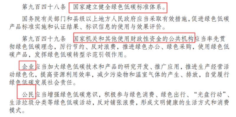 我们国家公共机关将带头节能降碳,企业也需要合法合规经营接受新的标准要求,个人也需要积极参与绿色消费、低碳出行。 通过法律的强制力,将绿色低碳内化为国家、企业和个人的共同行为准则,为构建人与自然和谐共生的现代化提供了坚实的法治保障。