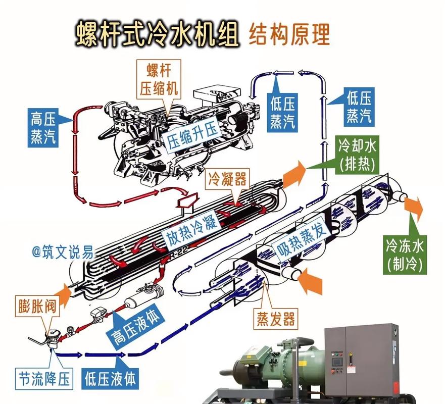 工作原理:制冷模式下,制冷剂在压缩机、风冷换热器、节流装置和水侧换热器之间循环,实现降温。制热模式下,通过四通换向阀切换制冷剂流向,从空气中吸热并释放至室内,实现供暖。