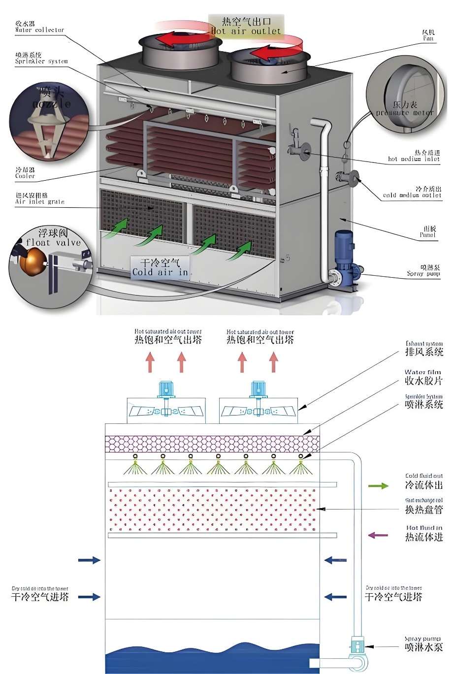 工作原理:喷淋水均匀喷洒在盘管表面,形成水膜。空气从塔底进入,与喷淋水和盘管进行热交换,喷淋水蒸发带走热量,管内介质被冷却后继续循环。