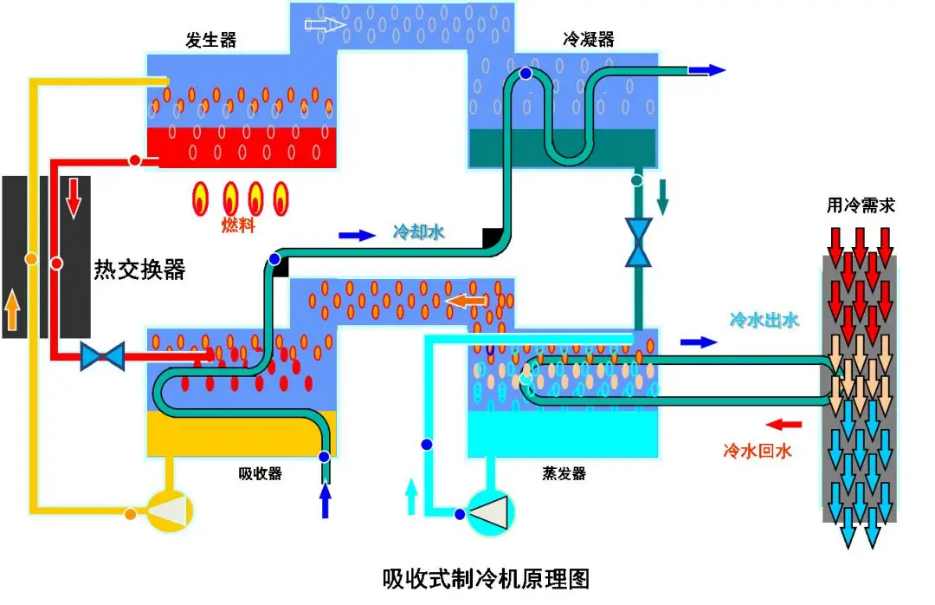 以热能为驱动能源,适用于有余热或电力紧张场所,常用溴化锂-水作为工质对。