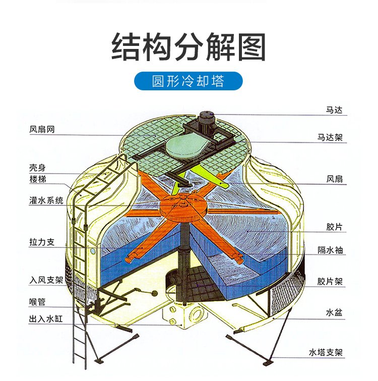 工作原理:热水经布水器喷洒在填料表面,形成水膜。空气从塔底进入,与水膜逆流或横流接触,通过蒸发和对流带走热量,冷却后的水落入水池循环使用。