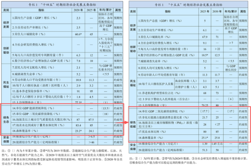 - 约束性指标强化:在“十五五“的20项主要指标中,约束性指标有8项,其中绿色低碳领域占5,表明绿色发展从“软指标”变成了必须完成的“硬任务”。